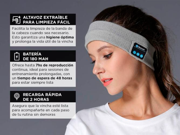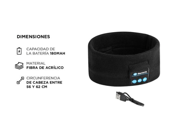 Cuenta con conexión BT 4.2 + EDR y un alcance de hasta 10 metros. Su batería de 180 mAh ofrece hasta 7 horas de reproducción continua y 48 horas en modo espera, con una carga completa en apenas 2 horas. Brinda un sonido nítido sin fugas hacia el exterior, ideal para usar en espacios compartidos. La tela es suave, elástica y cómoda para utilizar también en posición recostada.