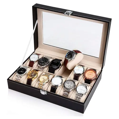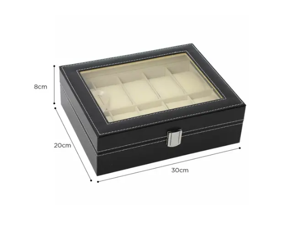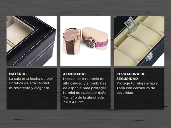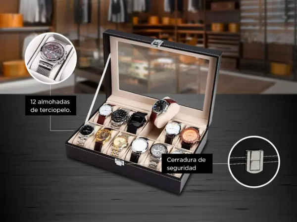 Capacidad para 12 relojes. Posee una tapa superior con ventana transparente de cristal que le proporciona un aspecto elegante y también facilita mostrar los relojes sin necesidad de abrir la caja. Bisagras, cerradura y llave de metal para una máxima protección. Almohadillas interiores extraíbles e independientes.
