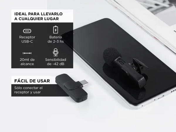 Plug & Play total: conectá el receptor a tu dispositivo con entrada USB tipo C y empezá a grabar al instante. Compatible con celulares, tablets y equipos que usen sistema operativo incorporado.