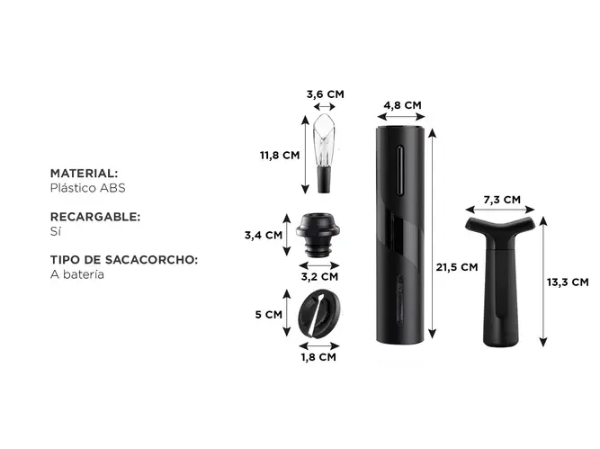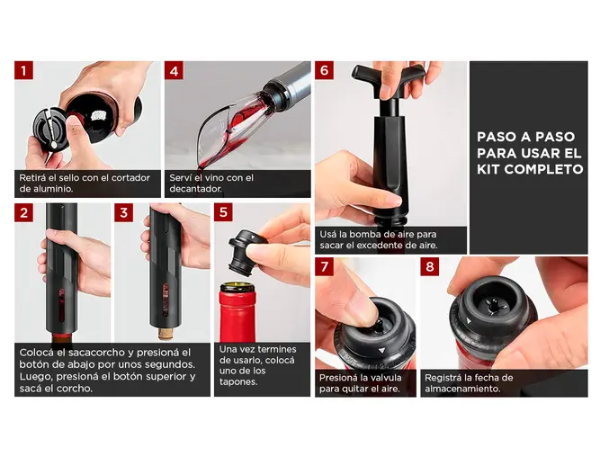 Este kit incluye 4 elementos esenciales para disfrutar de un buen vino: Sacacorchos Eléctrico, Decantador, Bomba de vacío y cortador. Es ideal para sommeliers y fanáticos del vino.