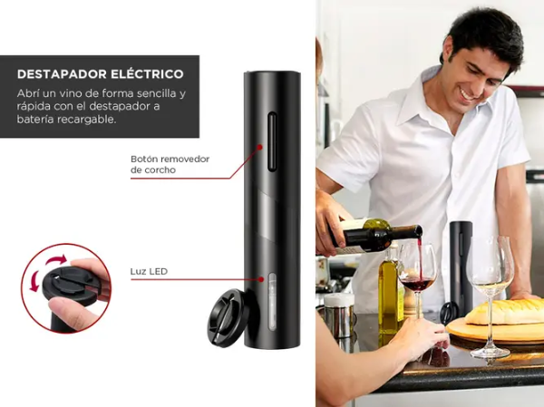 Con el sacacorcho a batería abrir un vino es una tarea mucho más sencilla y elegante. Solamente tendrás que colocar el sacacorcho sobre la botella y presionar un botón. No más fuerza extra ni corchos partidos