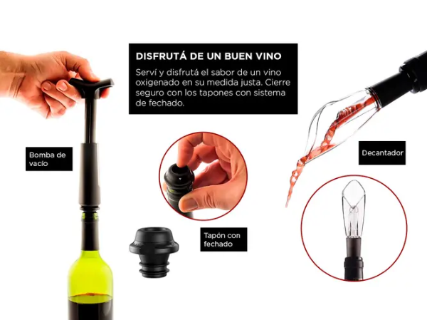 El decantador abre el vino en su medida justa para disfrutar de aromas y sabores en sus puntos juntos de oxigenación, y la bomba de vacío mantendrá fresca durante semanas la bebida utilizando los tapones incluidos en el set