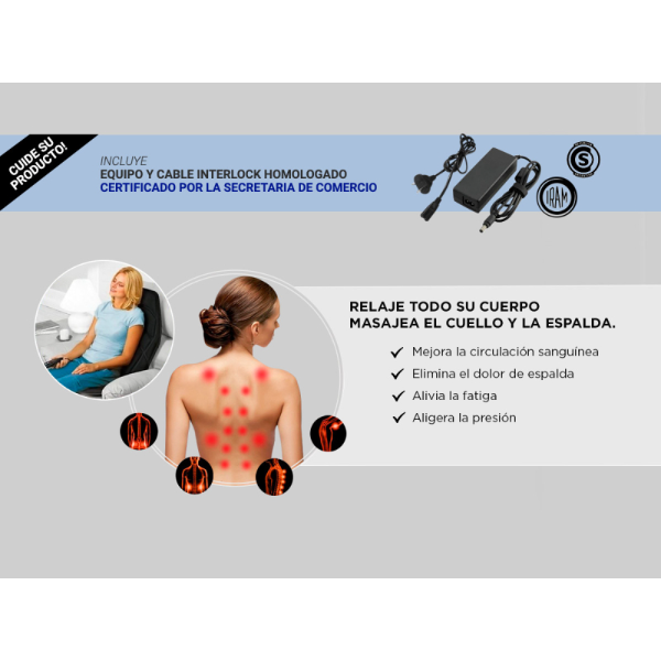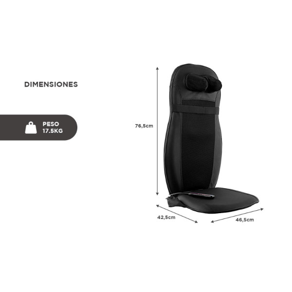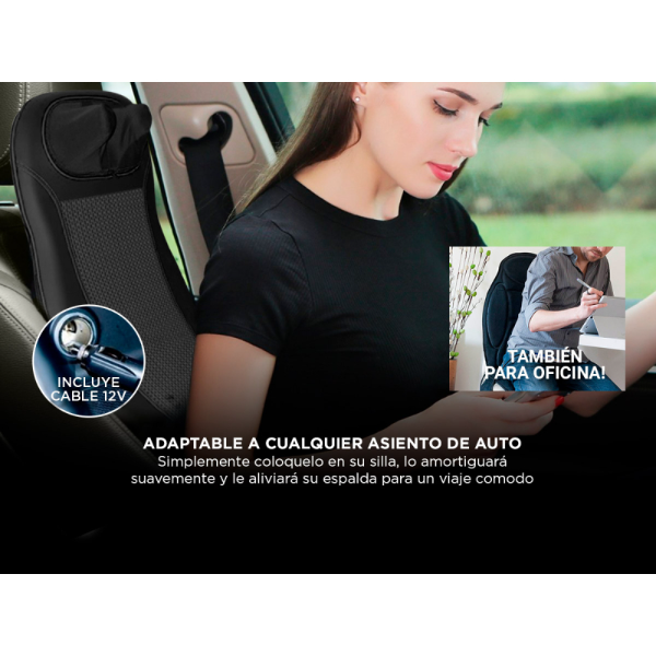 Gracias a la combinación de masaje shiatsu, vibración y terapia de calor, alivia dolores musculares y fatiga desde el cuello hasta los glúteos.