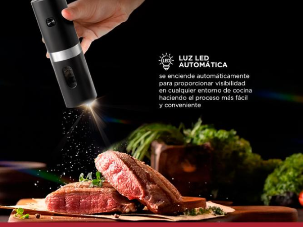 Diseñado para hacer tu experiencia culinaria más sencilla, este molinillo automático muele tus especias, sal o pimienta con solo una simple presión. Su luz LED se enciende automáticamente al estar en funcionamiento, proporcionando visibilidad en cualquier entorno de cocina.