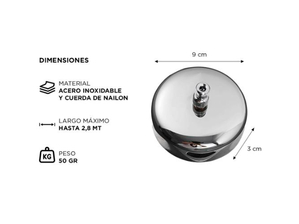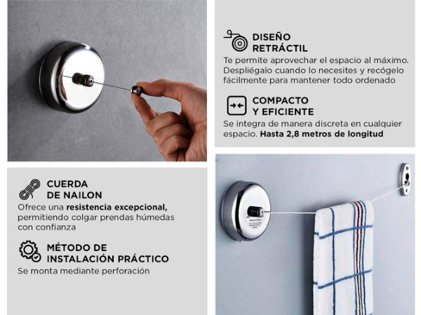 Compacto y Eficiente: Con dimensiones de 9 x 3 cm, este tendedero compacto se integra de manera discreta en cualquier espacio. Su eficiencia se refleja en su capacidad para soportar hasta 2,8 metros de longitud cuando está completamente extendido.