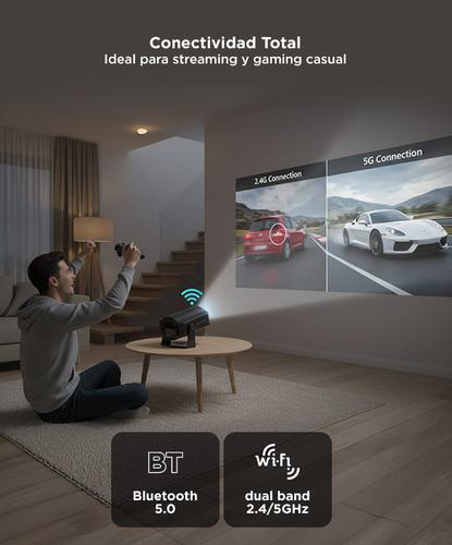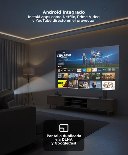 Compacto, liviano y potente, este proyector ofrece imagen de hasta 130” con resolución HD, conexión WiFi, Bluetooth y un sistema Android incorporado para que disfrutes tus apps favoritas sin necesidad de otros dispositivos. Transmití directamente desde tu celular o notebook con su función de pantalla duplicada, y ajustá todo a tu gusto gracias al enfoque manual y corrección trapezoidal. Perfecto para el hogar, oficina o escapadas.