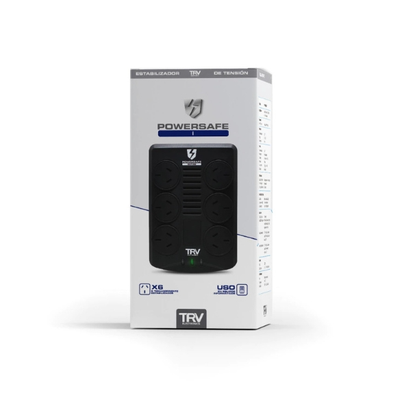 La familia de estabilizadores de tensión POWERSAFE 1i fue desarrollada para la protección de equipamientos electrónicos tales como: PC, notebook, router, modem, TV led, estaciones de juego u otros aparatos eléctricos que sean sensibles a las variaciones de tensión que ocurren en las redes de distribución eléctrica. Estabilizador de tensión POWERSAFE 1i /6 tomas IRAM /retardo de conexión /protección RJ-45. Potencia maxiam: 300W